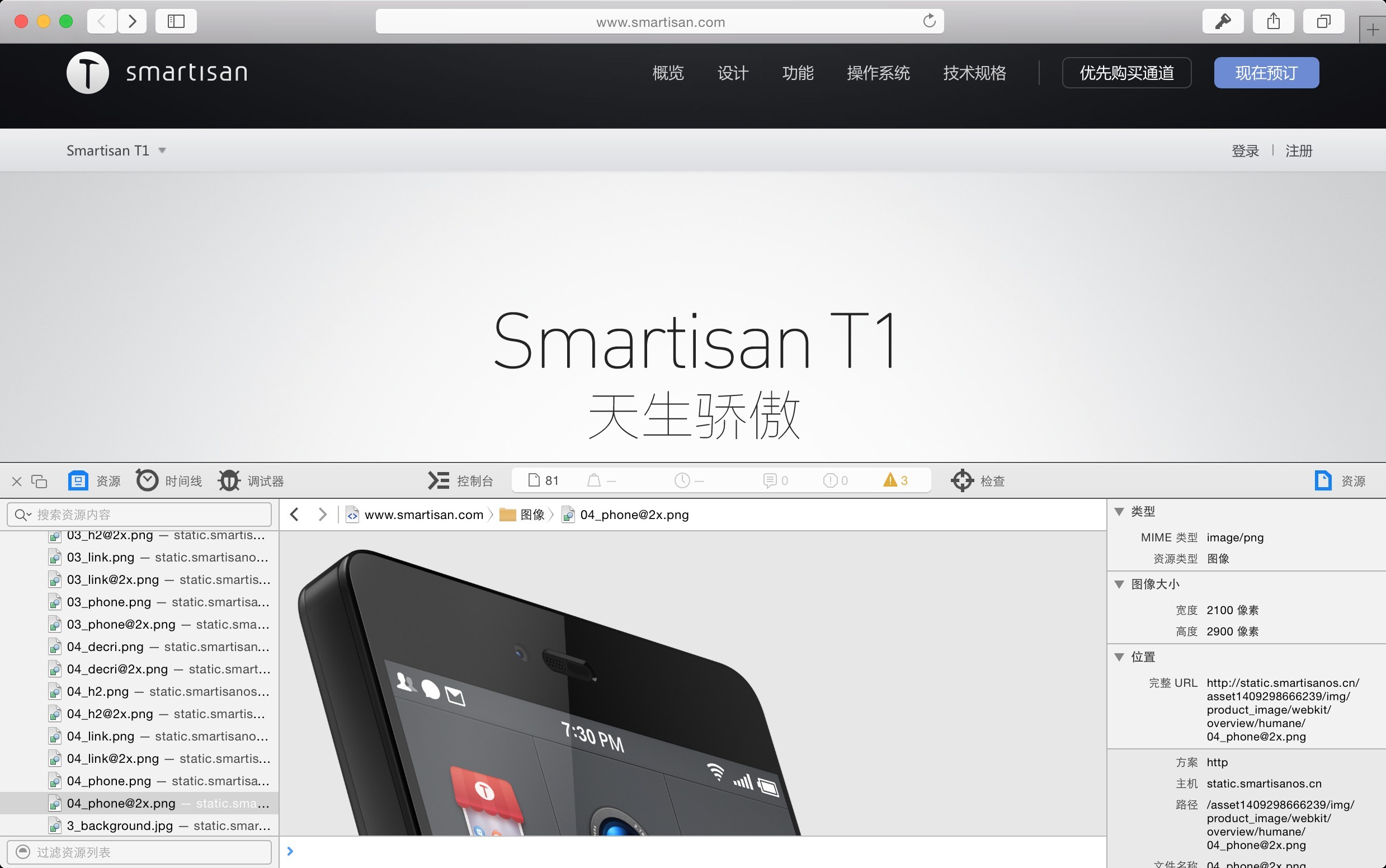 锤子的官网为大部分宣传图片都提供了 @2x 的图片,可惜不是所有。我想如果锤子本意是让使用 Retina 屏的人能获得更佳的浏览体验的话,那理所应当将全站都做到兼容。